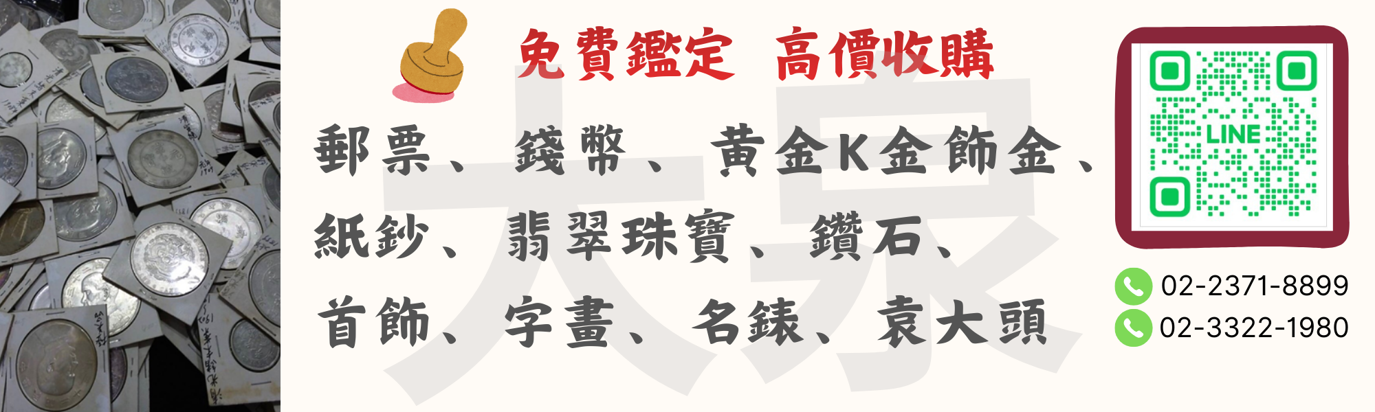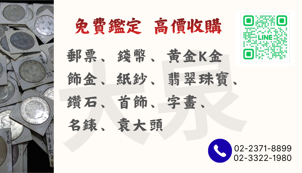 大泉錢幣成立於2011年6月,專門高價收購幣鈔/免費鑑定估價/錢幣投資諮詢。我們以全新的經營模式,希望能帶給您不一樣的視覺饗宴,歡迎您的蒞臨。 高價收購郵票 ,古董、字畫、錢幣、龍銀、 金銀幣 、老酒、金飾、黃金、鑚石、玉石、翡翠、勞力士、人蔘、袁大頭。免費估價,到府收購。